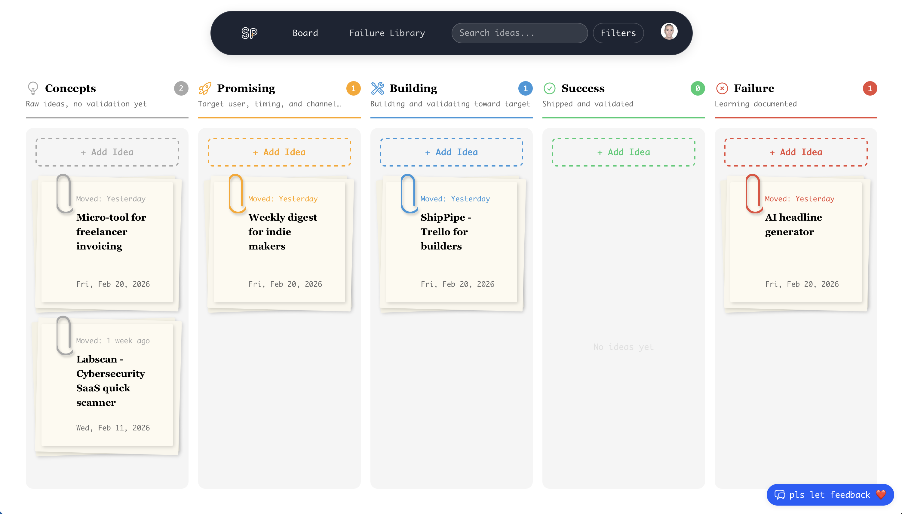 Ship Pipe structures idea development through 5 clear stages: (1) Concepts - Capture raw ideas without validation pressure. This is your idea inbox. (2) Promising - Ideas that pass validation gates by defining target user, launch timing, and distribution channel. (3) Building - Active development phase where you build toward your validation metrics. (4) Success - Shipped products that met their goals and achieved product-market fit. (5) Failure - Ideas that didn't work out, with a short lesson learned to capture what you'd do differently. This structure keeps you focused and prevents premature building.
